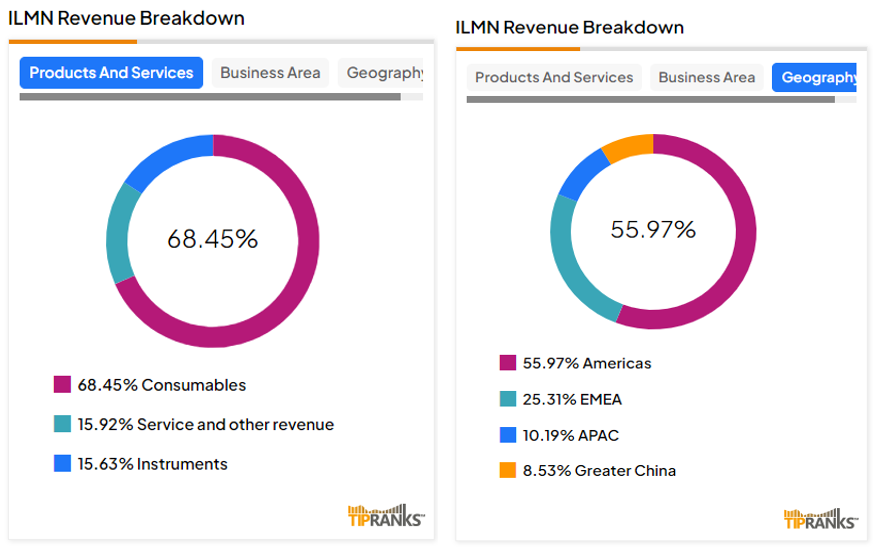 Illumina generates over 68% of its revenues from the sale of Consumables, 15.6% from the sale of Instruments (both combined as Product Revenue), and the remaining 15.9% from Service and other revenues.
