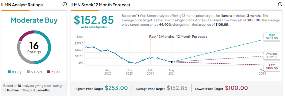 Overall, ILMN stock has a Moderate Buy consensus rating based on eight Buys, five Holds, and three Sell recommendations on TipRanks. The average Illumina price target of $152.85 implies 44.4% upside potential in the next twelve months.