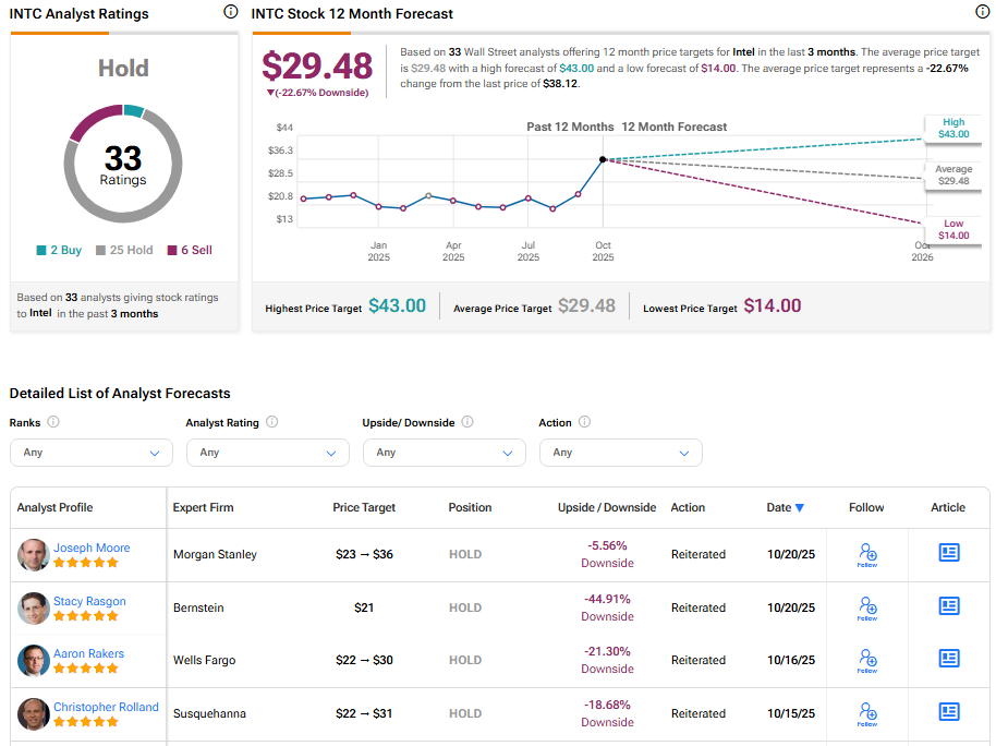 With 25 Holds, six Sells, and two Buy recommendations, Wall Street has a Hold consensus rating on Intel stock. The average INTC stock price target of $29.48 indicates a possible downside of 22.67% from current levels.