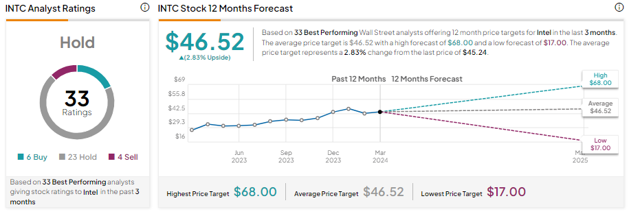 INTC stock has six Buy, 23 Hold, and four Sell recommendations for a Hold consensus rating. Analysts’ average price target on INTC stock is $46.52, implying an upside potential of 2.83% from current levels.