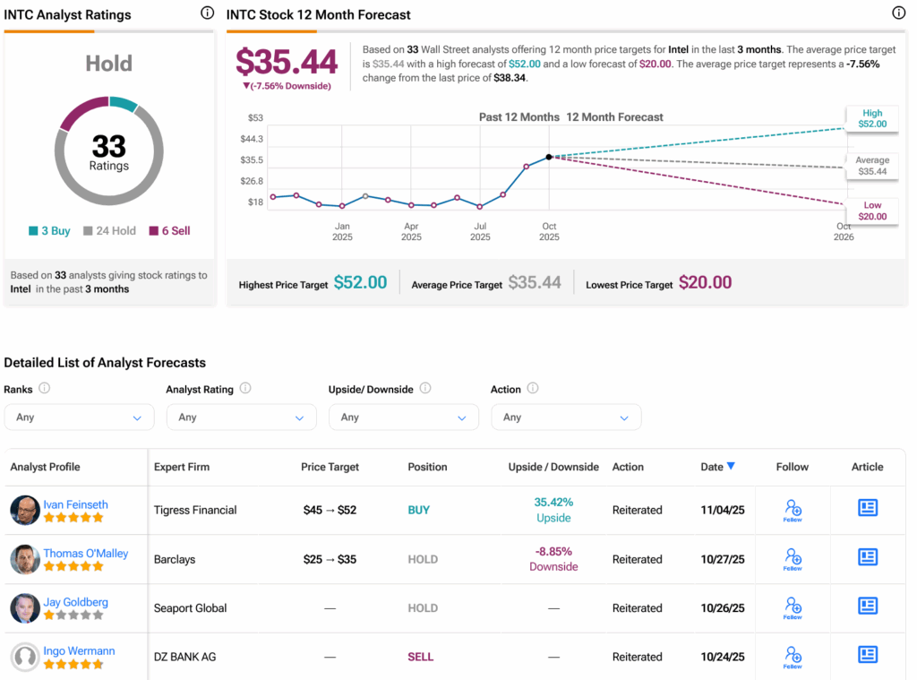 Turning to Wall Street, analysts have a Hold consensus rating on INTC stock based on three Buys, 24 Holds and six Sells assigned in the past three months, as indicated by the graphic below. After a 52.22% rally in its share price over the past year, the average INTC price target of $35.44 per share implies 7.56% downside risk.