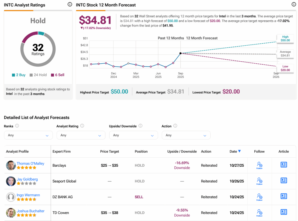 Turning to Wall Street, analysts have a Hold consensus rating on INTC stock based on two Buys, 24 Holds and six Sells assigned in the past three months, as indicated by the graphic below. After a 72.66% rally in its share price over the past year, the average INTC price target of $34.81 per share implies 17.02% downside risk.