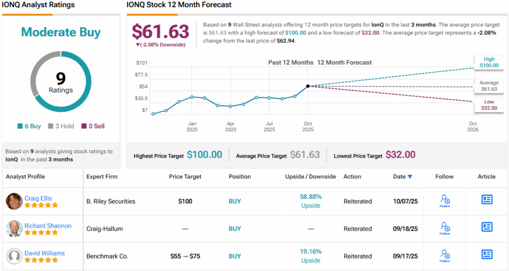 The Street’s stance on IONQ presents an interesting contradiction. On one hand, the stock carries a Moderate Buy consensus rating, supported by 6 Buy recommendations and 3 Holds. On the other hand, the average 12-month price target sits at $61.63, implying a modest ~2% downside from current levels – suggesting that the recent bull run has pushed the stock further than most analysts had anticipated. (See IONQ stock forecast)