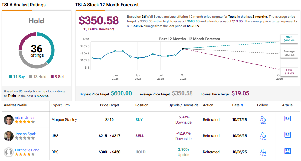 Wall Street is quite mixed when it comes to TSLA. With 14 Buys, 13 Holds, and 9 Sells, TSLA carries a consensus Hold (i.e. Neutral) rating. Its 12-month average price target of $350.58 implies a downside approaching 20%. (See TSLA stock forecast)