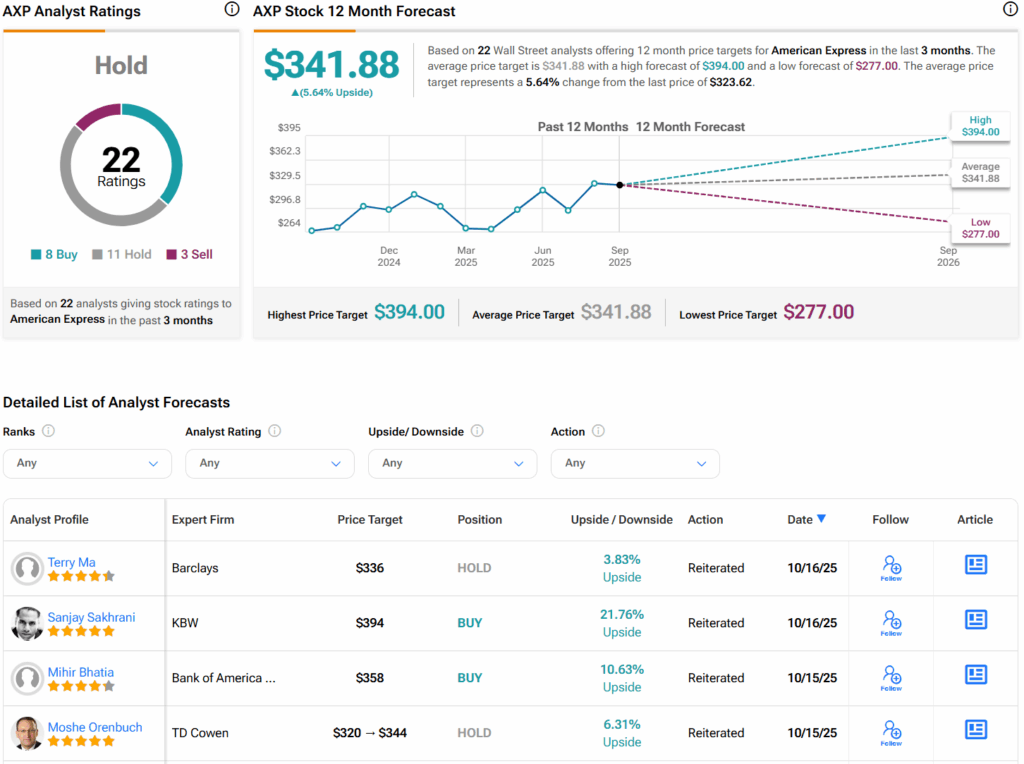Separately, JPMorgan (JPM) also raised its price target for American Express, increasing it from $343 to $355, while keeping a Hold rating. In its Q3 earnings preview, JPMorgan pointed out that there is a growing gap between high-income and low-income consumers. The firm is especially cautious about risks facing low-income consumers and says that these issues make it more selective about which financial companies it recommends.