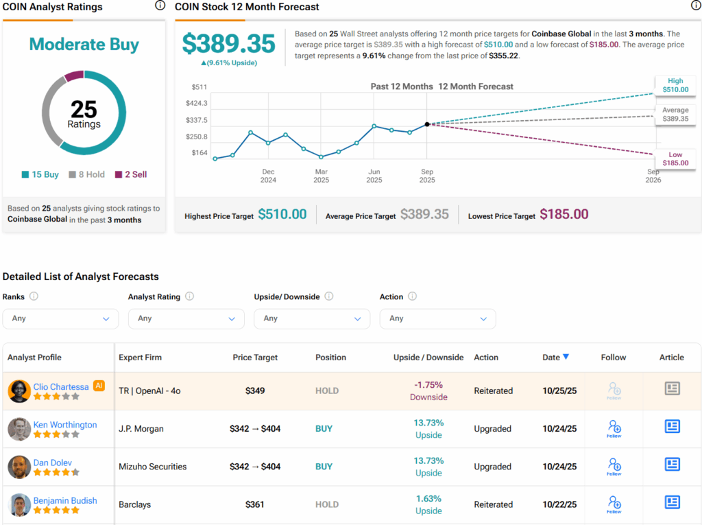 Turning to Wall Street, analysts have a Moderate Buy consensus rating on Coinbase stock based on 15 Buys, eight Holds, and two Sells assigned in the past three months, as indicated by the graphic below. Furthermore, the average COIN price target of $389.35 per share implies 9.6% upside potential.