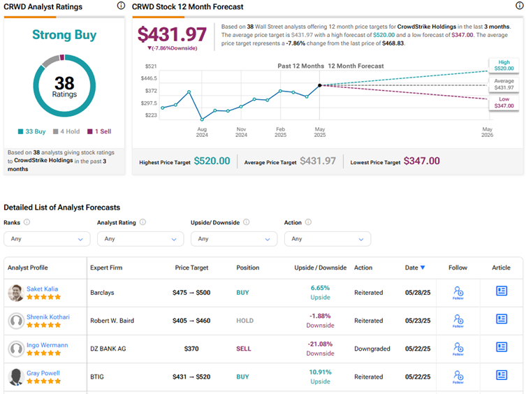 With 33 Buys, four Holds, and one Sell recommendation, CrowdStrike scores a Strong Buy consensus rating on TipRanks. The average CRWD stock price target of $431.97 implies a downside risk of about 8% from current levels, given the year-to-date rally in the stock.