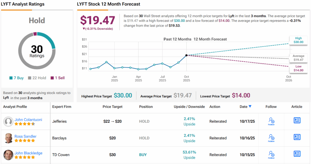 Wall Street isn’t quite ready to hail this ride, however. With 22 Holds far outpacing 7 Buys and 1 Sell, LYFT carries a consensus Hold (i.e. Neutral) rating. Its 12-month average price target of $19.47 implies minimal movement up ahead. (See LYFT stock forecast)