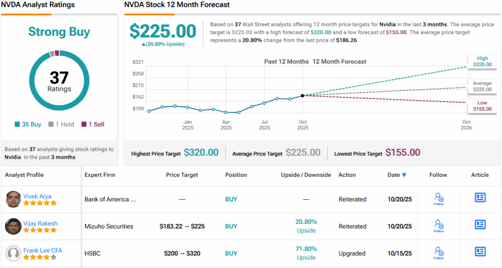 Nvidia remains as popular as ever on Wall Street as well. With 35 Buys far outshining 1 Hold and 1 Sell, NVDA boasts a Strong Buy consensus rating. Its 12-month average price target of $225 implies a potential upside just shy of 21%. (See NVDA stock forecast)