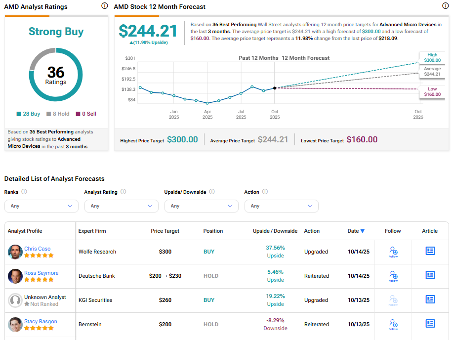Currently, Wall Street has a Strong Buy consensus rating on Advanced Micro Devices stock based on 28 Buys and eight Holds. The average AMD stock price target of $244.21 indicates about 11.98% upside potential.
