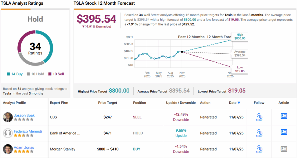As Fiorillo mentions, TSLA provokes a wide range of opinions, with price targets ranging vastly from a Street-high $800.00 to a low of $19.05. Its 14 Buys, 10 Holds, and 10 Sells give TSLA a consensus Hold rating, while a 12-month average price target of $395.54 implies a downside in the high single digits. (See TSLA stock forecast)