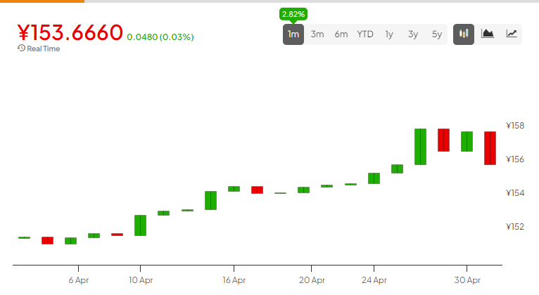 - 3:35 PM EST, Wednesday: The Yen’s plunge continues, breaking past 155.00 in what appears to be another round of BoJ’s cost-effective intervention during off-peak hours.