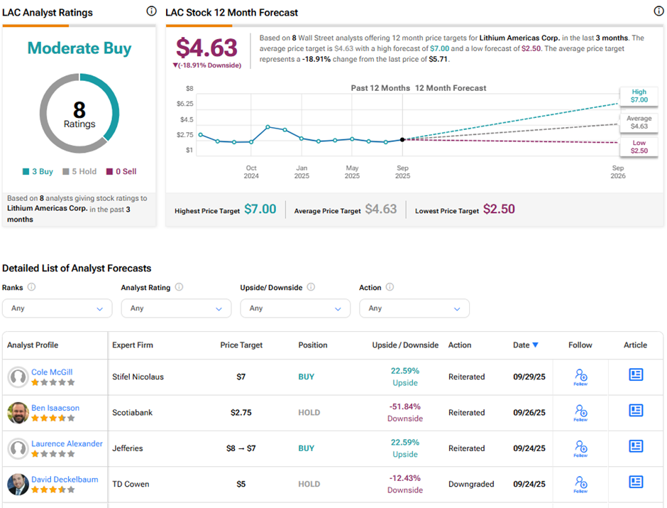 Analysts remain divided on Lithium Americas’ long-term outlook. On TipRanks, LAC stock has a Moderate Buy consensus rating based on three Buys and five Hold ratings. The average Lithium Americas price target of $4.63 implies 18.9% downside potential from current levels. Despite this cautious view, LAC stock has surged over 92% year-to-date.