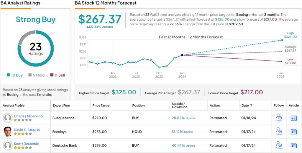 So, that’s Deutsche Bank’s take, what does the rest of the Street have in mind for BA? Most (unlike some of Boeing’s panels) remain on board. Based on a mix of 18 Buys vs. 5 Holds, the stock claims a Strong Buy consensus rating. Going by the $267.37 average target, a year from now, shares are expected to generate returns of ~28%. (See Boeing stock forecast)