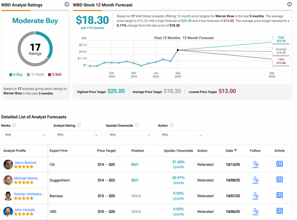 Turning to Wall Street, analysts have a Moderate Buy consensus rating on WBD stock based on six Buys and 11 Holds assigned in the past three months, as indicated by the graphic below. After a 137.15% rally in its share price over the past year, the average WBD price target of $18.30 per share implies 0.11% upside potential.