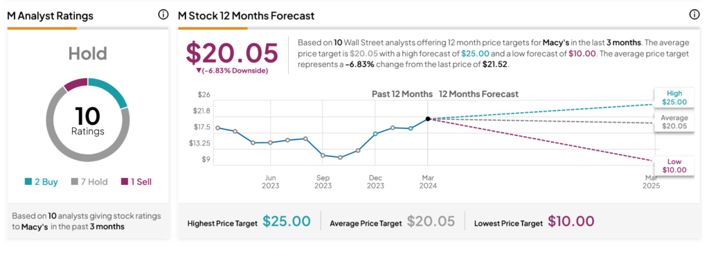 Turning to Wall Street, analysts have a Hold consensus rating on Macy’s stock based on two Buys, seven Holds, and one Sell assigned in the past three months, as indicated by the graphic below. After an 18.43% rally in its share price over the past year, the average M price target of $20.05 per share implies 6.83% downside risk.