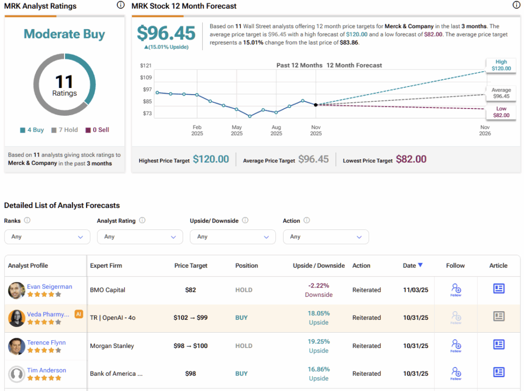 Turning to Wall Street, MRK stock carries a Moderate Buy consensus rating based on four Buys, seven Holds, and zero Sell ratings over the past three months. The average MRK stock price target is $96.45, implying 15% upside potential.