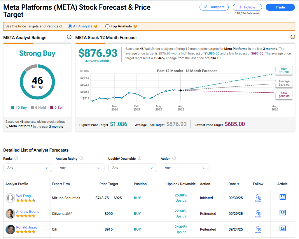 The stock of Meta Platforms has a consensus Strong Buy rating among 46 Wall Street analysts. That rating is based on 40 Buy and six Hold recommendations issued in the last three months. The average META price target of $876.93 implies 19.46% upside from current levels.