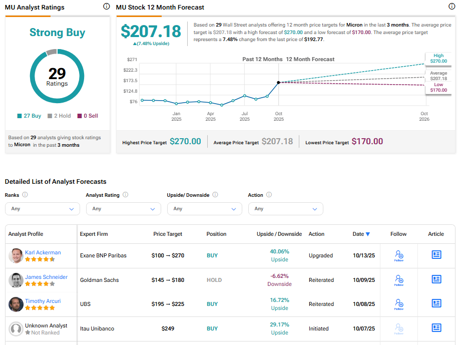 Micron stock has a consensus Strong Buy rating among 29 Wall Street analysts. That rating is based on 27 Buy and two Hold recommendations assigned in the last three months. The average MU price target of $207.18 implies 7.48% upside from current levels.