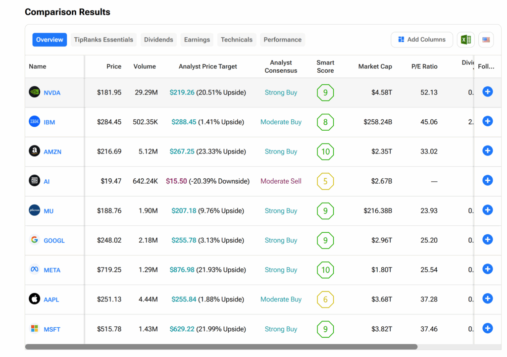 With tech companies and asset managers joining forces to pump heavy investments into AI infrastructure, selecting the right stock is increasingly essential for investors. The TipRanks Stock Comparison tool provides direction on which AI stocks Wall Street analysts consider as top investment choices — see the graphics below for details.