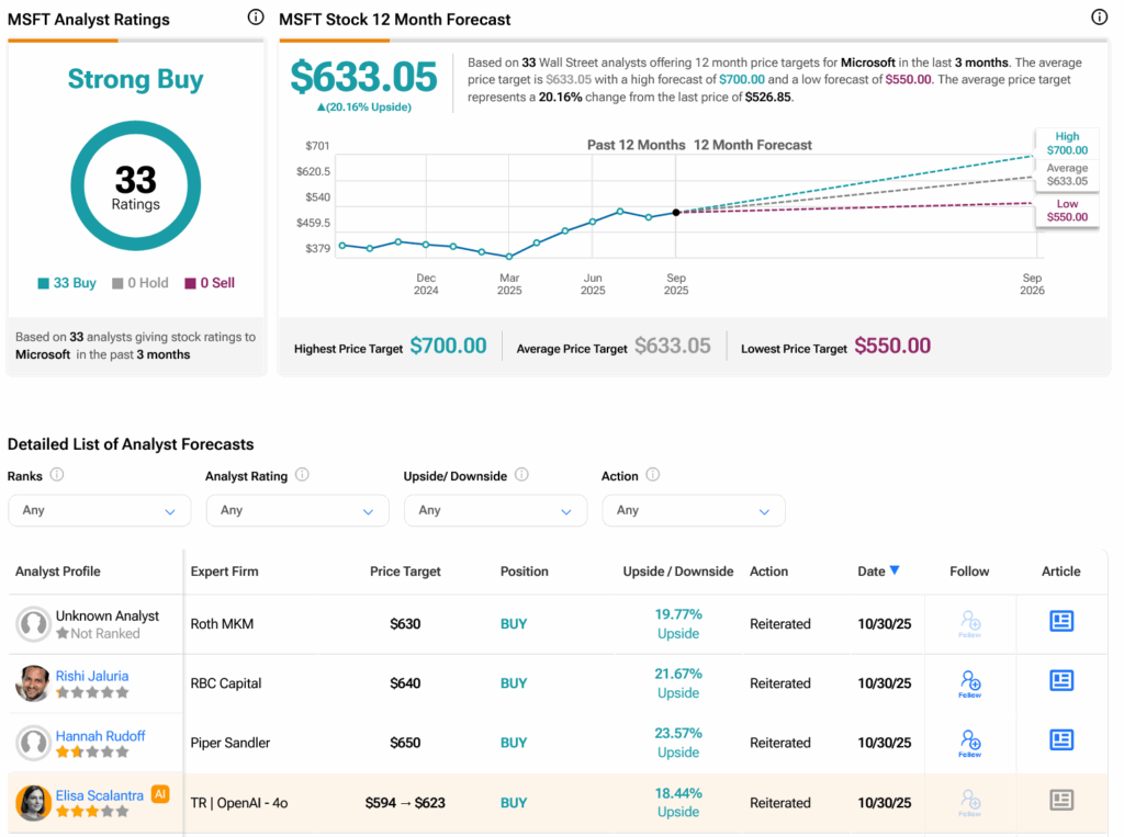 Turning to Wall Street, analysts have a Strong Buy consensus rating on MSFT stock based on 33 Buys assigned in the past three months, as indicated by the graphic below. After a 33.27% rally in its share price over the past year, the average MSFT price target of $633.05 per share implies 20.16% upside potential.