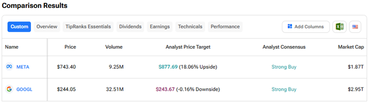 Using TipRanks’ Stock Comparison Tool, we see that Wall Street has a Strong Buy consensus rating on both META and GOOGL stocks. The average META stock price target of $877.69 indicates 18.1% upside potential. META stock has risen about 27% year-to-date.