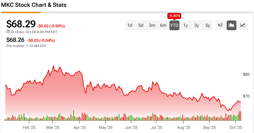 McCormick stock was down 0.04% in pre-market trading on Tuesday, following a 0.9% dip yesterday. The shares have fallen 9.36% year-to-date and 14.24% over the past 12 months. Chairman, President, and CEO Brendan Foley noted that tariffs and inflation continue to be headwinds for the company.