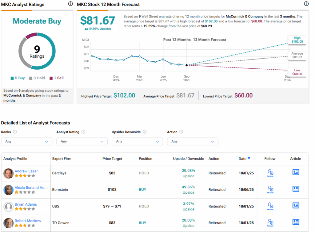 Turning to Wall Street, the analysts’ consensus rating for McCormick is Moderate Buy, based on five Buy, three Hold, and a single Sell rating over the past three months. With that comes an average MKC stock price target of $81.67, representing a potential 19.59% upside for the shares. These ratings and price targets will likely change as analysts update their coverage after today’s earnings report.