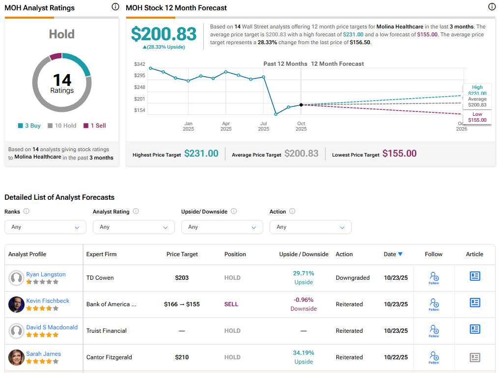 Currently, Wall Street has a Hold consensus rating on Molina Healthcare stock based on 10 Holds, three Buys, and one Sell recommendation. The average MOH stock price target of $200.83 indicates 28.3% upside potential.