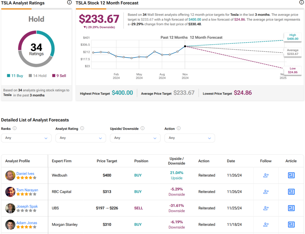 Although retail investors cannot invest in xAI due to its status as a private startup, they can invest in Musk’s most popular venture, Tesla. Turning to Wall Street, analysts have a Hold consensus rating on TSLA stock based on 11 Buys, 14 Holds, and nine Sells assigned in the past three months, as indicated by the graphic below. After a 61% rally in its share price over the past three months, the average TSLA price target of $233.67 per share implies 29.3% downside risk.