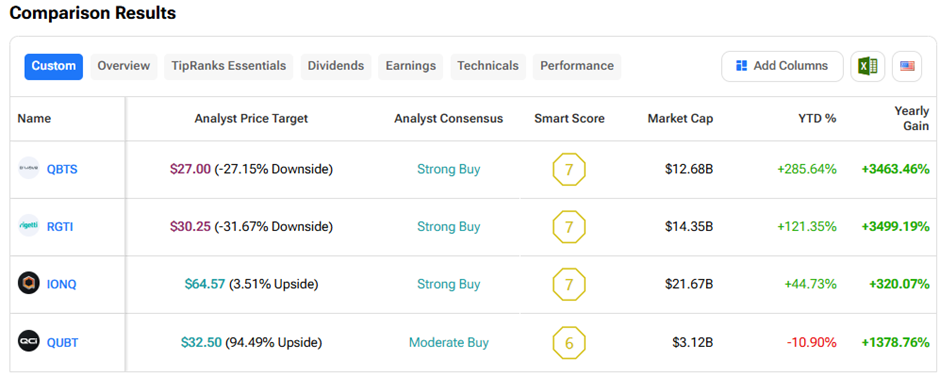 Using TipRanks’ Stock Comparison Tool, we can see that both QBTS and RGTI have delivered the strongest share price gains within the quantum sector, outpacing players like IonQ Inc. (IONQ) and Quantum Computing Inc. (QUBT), showcasing investor confidence aligned with their accelerating growth stories.