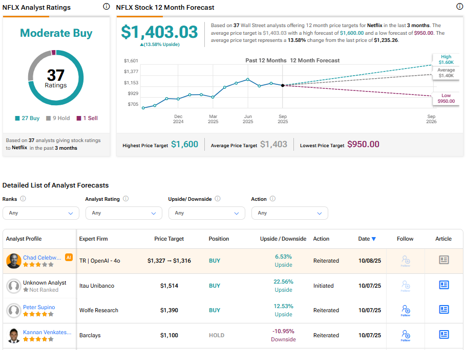 On TipRanks, NFLX stock has received a Moderate Buy consensus rating, with 27 Buys, nine Holds, and one Sell assigned in the last three months. The average Netflix stock price target is $1,403.03, suggesting an upside potential of 13.58% from the current level.