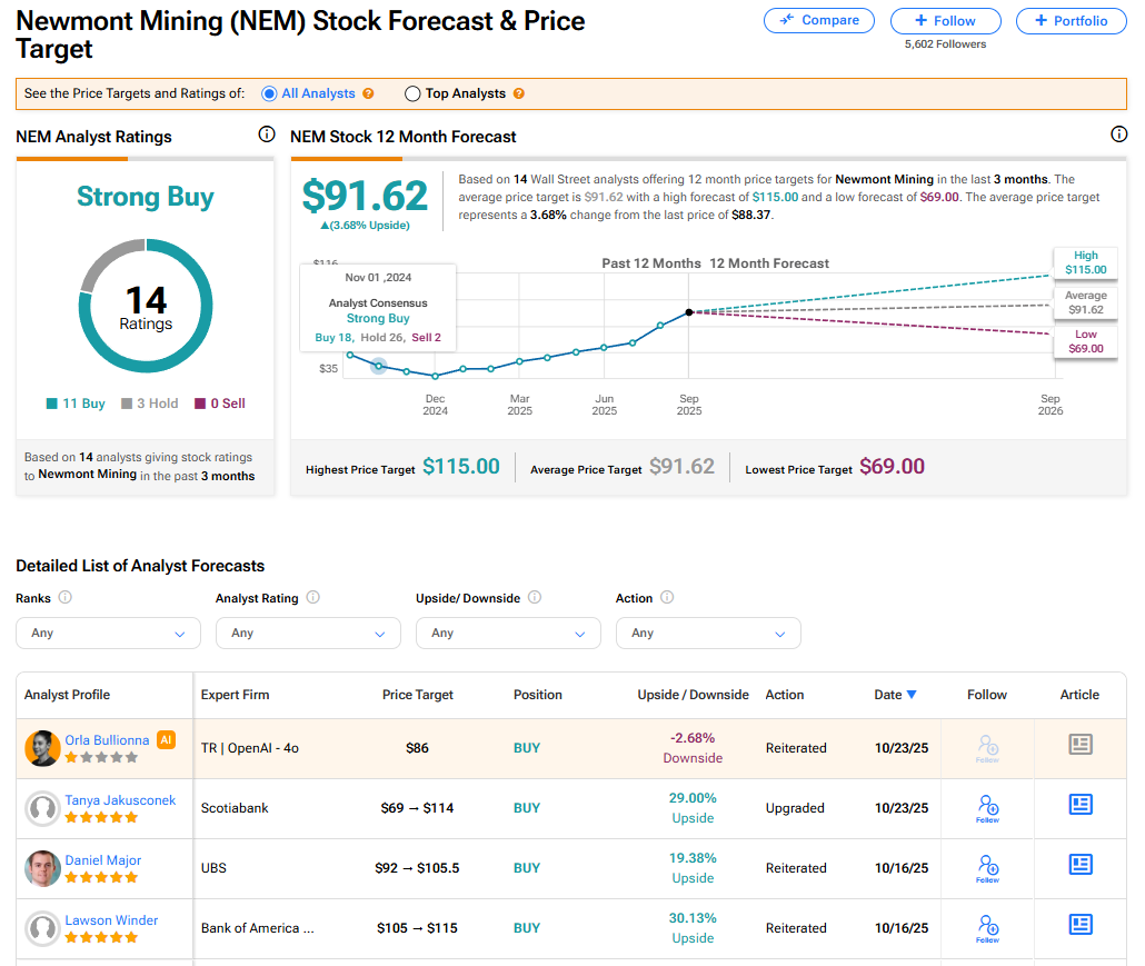 The stock of Newmont has a consensus Strong Buy rating among 14 Wall Street analysts. That rating is based on 11 Buy and three Hold recommendations issued in the last three months. The average NEM price target of $91.62 implies 3.68% upside from current levels.