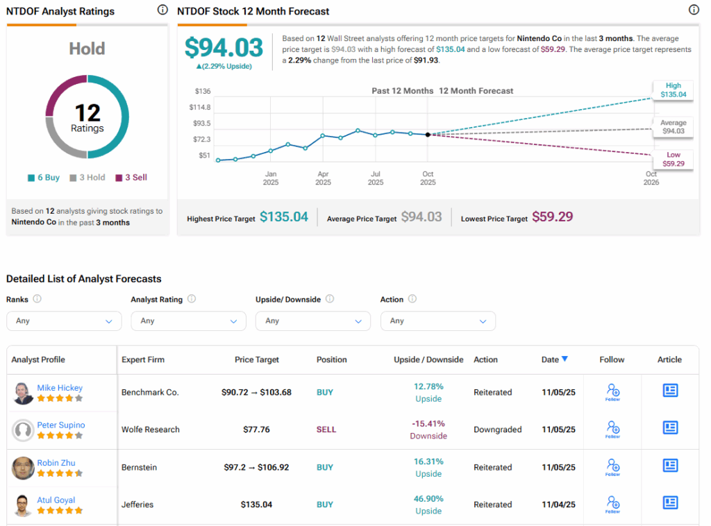 Turning to Wall Street, the analysts’ consensus rating for Nintendo is Hold, based on six Buy, three Hold, and three Sell ratings over the past three months. With that comes an average NTDOF stock price target of $94.03, representing a potential 2.29% upside for the shares.