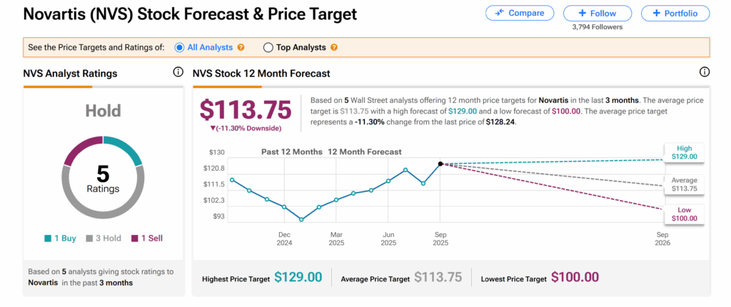 Turning to Wall Street, Novartis’s shares currently have a Hold consensus rating on TipRanks, based on one Buy, three Holds, and one Sell assigned by five Wall Street analysts over the past three months. This is even as the average NVS price target of $113.75 points to an 11.30% downside risk.