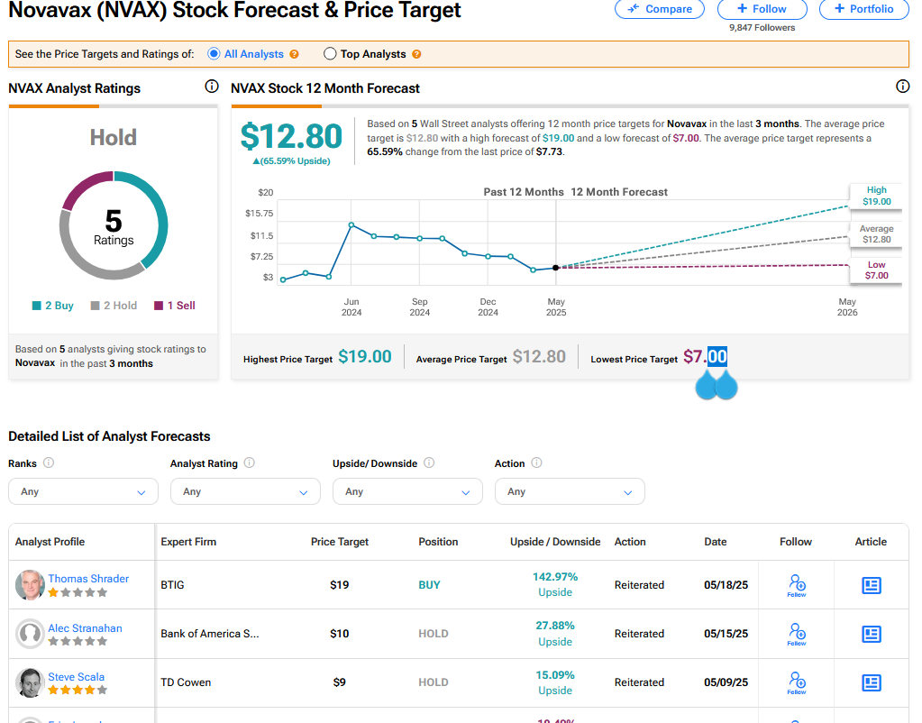 On TipRanks, NVAX has a Hold consensus based on 2 Buy, 2 Hold and 1 Sell rating. Its highest target price is $19. NVAX stock’s consensus price target is $12.80 implying an 65.59% upside.