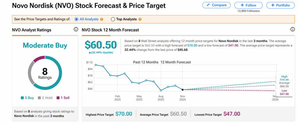 According to TipRanks, the average NVO price target of $60.50 indicates more than 32% upside potential from the current trading level.
