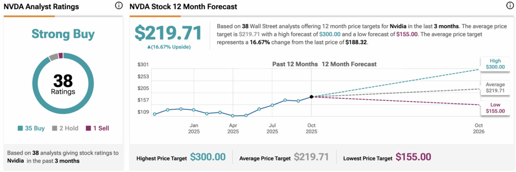 According to data from 38 Wall Street analysts, Nvidia carries a “Strong Buy” consensus rating. Of those, 35 rate the stock a Buy, two recommend Hold, and one suggests Sell.