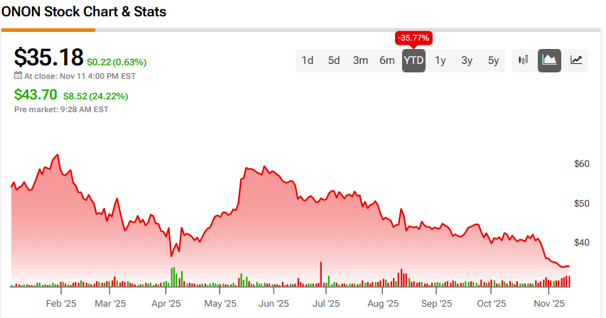 Trading activity is heavy today, as some 6.9 million shares changed hands. That’s up from ONON stock’s three-month daily average trading volume of about 5.93 million units.