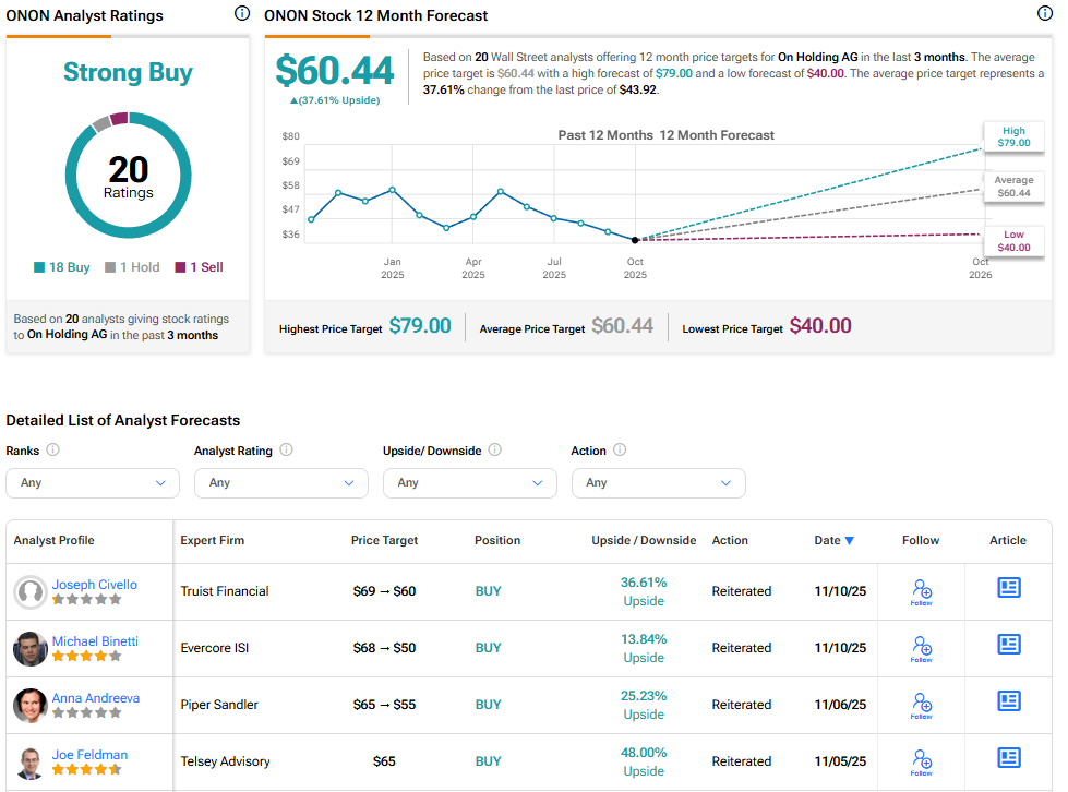 Turning to Wall Street, the analysts’ consensus rating for On is Strong Buy, based on 18 Buy, one Hold, and a single Sell rating over the past three months. With that comes an average ONON stock price target of $60.44, representing a potential 37.61% upside for the shares. These ratings and price targets will likely change as analysts update their coverage after today’s earnings report.