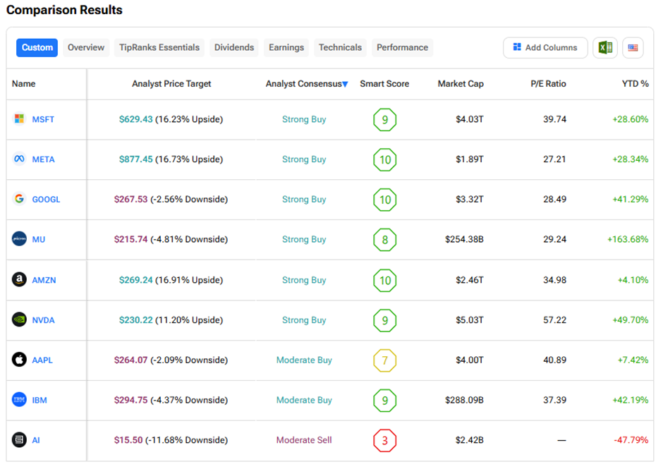 We used the TipRanks Stock Comparison Tool for the Best AI Stocks to determine which company is preferred by analysts.