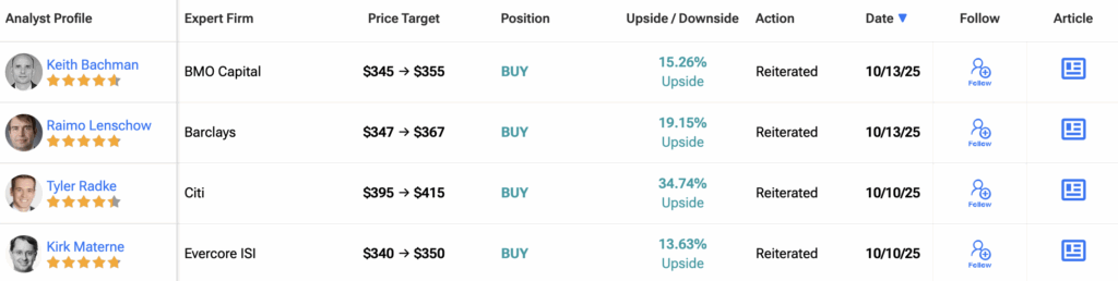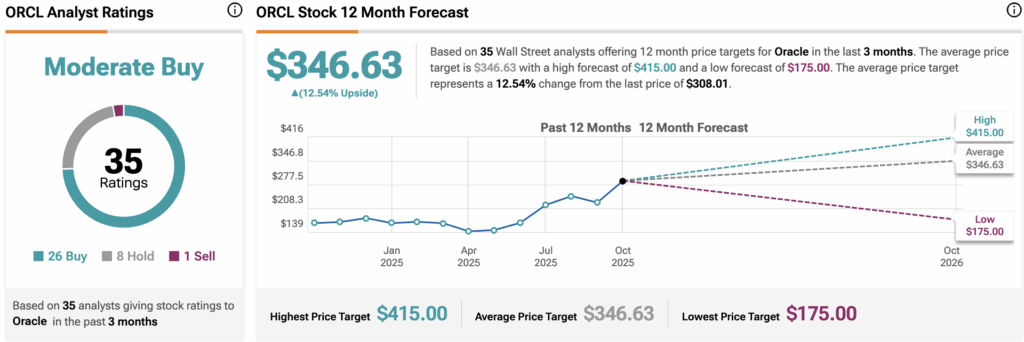 Currently, Wall Street has a Moderate Buy consensus rating on Oracle stock based on 26 Buys, eight Holds, and one Sell recommendation. The average ORCL stock price target of $346.63 indicates 12.5% upside potential from current levels.