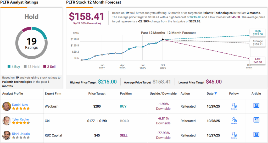 3 other analysts are also positive on PLTR’s prospects, but with an additional 13 Holds and 2 Sells, the analyst consensus rates the stock a Hold (i.e., Neutral). Going by the $158.41 average target, a year from now, shares will be changing hands for a 22% discount. (See PLTR stock forecast)
