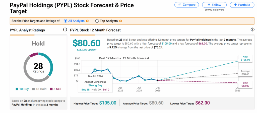 Turning to Wall Street, PayPal’s shares currently have a Hold rating, according to TipRanks data. This is based on 10 Buys, 15 Holds, and three Sells issued by 28 analysts over the past three months.