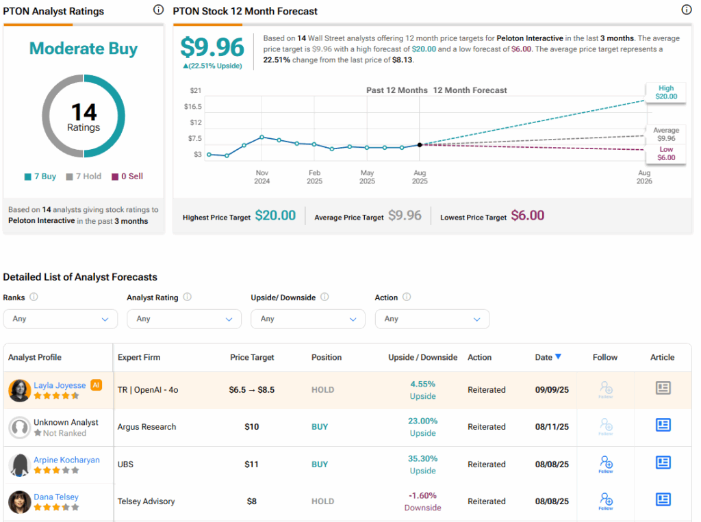 Turning to Wall Street, the analysts’ consensus rating for Peloton is Moderate Buy, based on seven Buy and seven Hold ratings over the past three months. With that comes an average PTON stock price target of $9.96, representing a potential 22.51% upside for the shares.