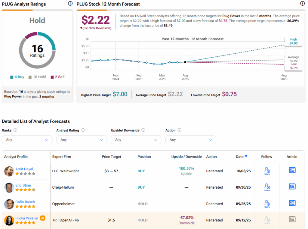 Turning to Wall Street, the analysts’ consensus rating for Plug Power is Hold, based on four Buy, 10 Hold, and two Sell ratings over the past three months. With that comes an average PLUG stock price target of $2.22, representing a potential 36.39% downside for the shares.