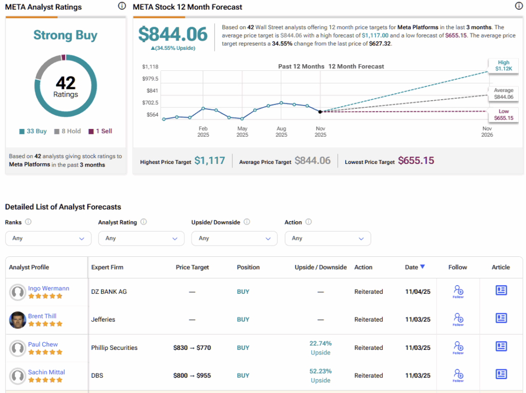 Wall Street remains quite bullish on Meta, despite the violent post-earnings sell-off. The stock now carries a Strong Buy consensus rating based on 33 Buy, eight Hold, and just one Sell ratings over the past three months. In fact, Meta’s average stock price target of $844.06 suggests ~34% upside over the next year.