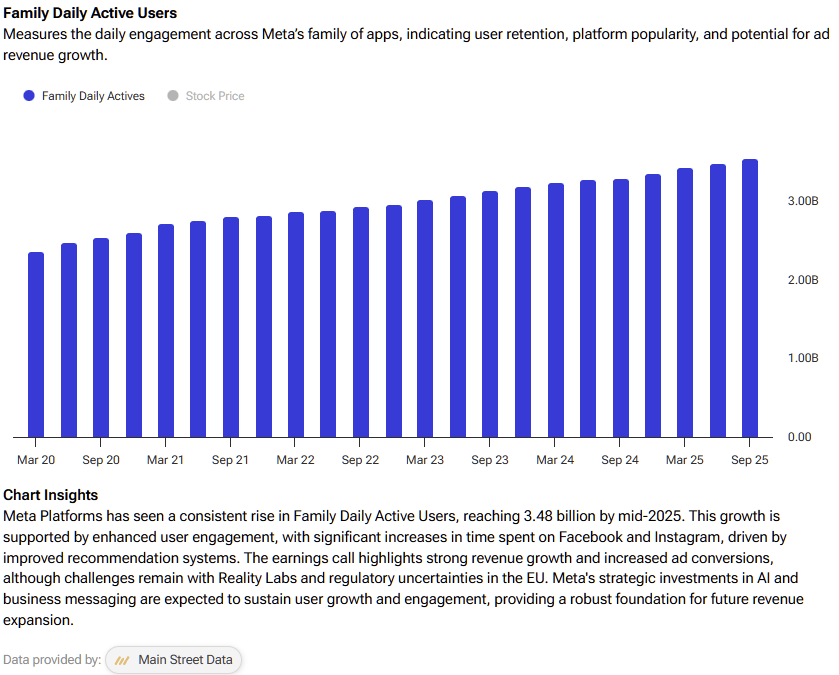 Revenue growth re-accelerated from 22% in Q2 to 26% in Q3. Ad impressions increased 14%, while the average price per ad rose 10% — a rare and highly sought-after combination of expanding supply and higher pricing power. Meanwhile, META user numbers are accelerating 8% year-over-year (up from 6% in Q2) — a staggering figure for a company of Meta’s scale, with ~3.5 billion people using one of its apps every day.