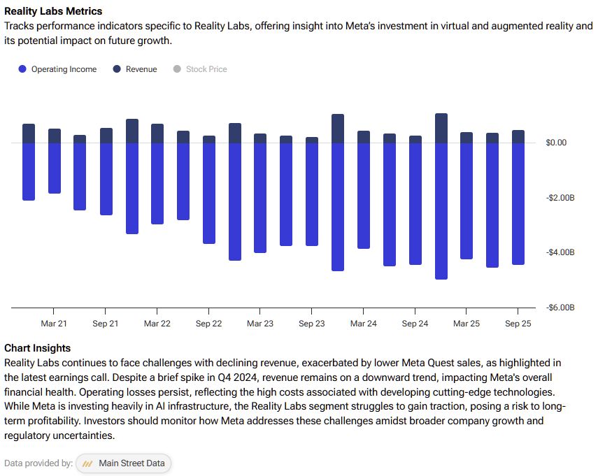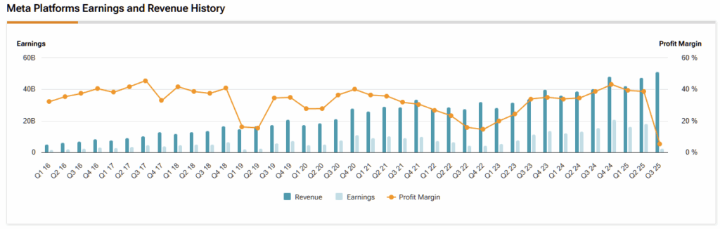 However, I think today’s setup is fundamentally different. Meta still delivered a 40% operating margin this quarter — down from 43% last year, but exceptional nonetheless. The EPS miss was entirely due to a one-time, non-cash tax adjustment. And while Reality Labs continues to post sizable losses (about $4.4 billion in Q3), the crucial distinction lies in where the heavy spending is going.