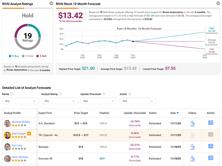 Overall, Wall Street has a Hold consensus rating on Rivian Automotive stock based on nine Holds, five Buys, and five Sell recommendations. The average RIVN stock price target of $13.42 indicates downside risk of 25.5% from current levels.